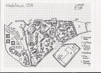 Heshtown is the Santo Domingo of its world, a horrible, vicious place filled with mercenaries, killers, lunatics, people who have fled across six thousand kilometres of ocean for a reason, and so on. It's got a working population of about 7,000 counting slaves, with rings of plantations stretching out across the island.