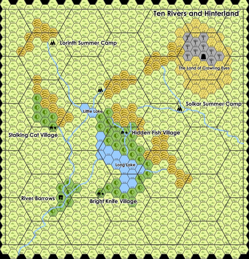 This map is to the immediate south of the Cauldron and Hinterland map. You can click on it for a larger version. The Lorinths and Solkars, like the Torbails, are nomads, while the villages are Hill People. Dwer Tor is the south, and will be on the next regional map.