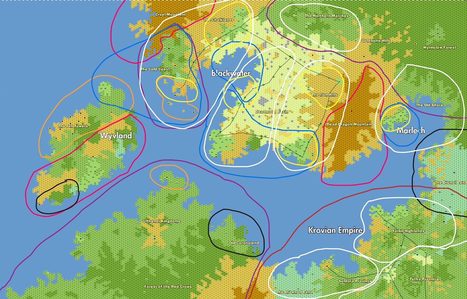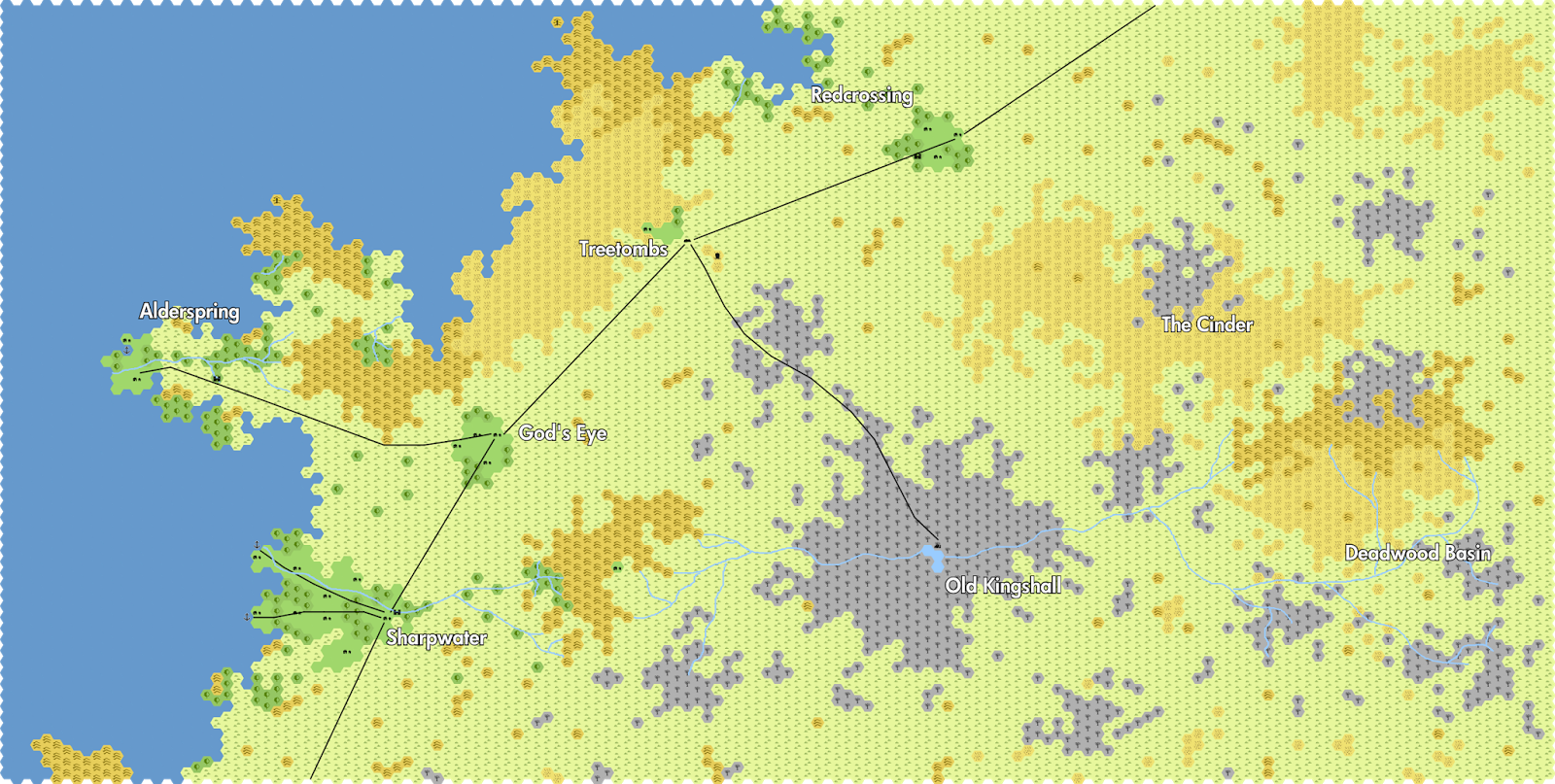 Deadwood Basin was once the country's breadbasket, densely populated with small villages and keeps. Since the Grey Death came nearly a century ago, the region has been unpopulated and almost nothing will grow there. The area is spotted with ruins from prior epochs - geomantic locuses from the Wyvish Synod, ruined keeps from the Weaver Kings, and buried remnants of the Dragontime. A few tribes of Bonewarped have come down off of Dead Dragon Mountain over the years, and survive by unknown means amongst the ruins. The Old King's hordes are mostly deployed holding ruins across Deadwood, though why he is focused on this instead of reconquering his kingdom is unclear to the living.