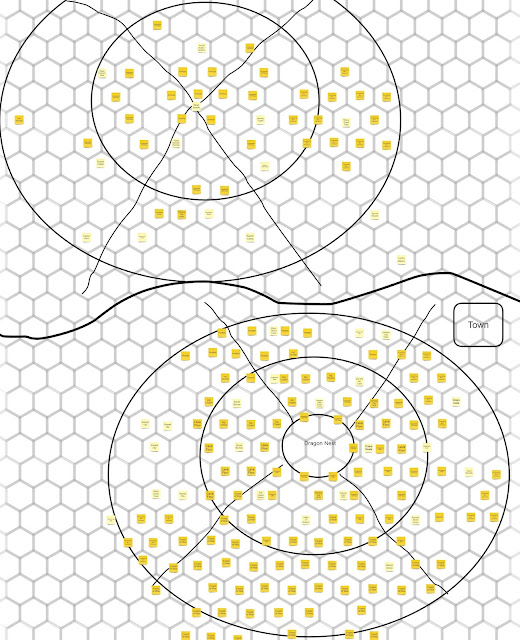 This is a map of the area immediately surrounding Hoch, including a small portion of the north-eastern slope of Feuerberg (Feuerberg and Himmelberg together cover about 714 km^2, about a tenth of the total ground area of the sub-range they belong to, which is comparable to Mahadur Himchal, the subrange that Everest belongs to). The blue post-its are above-ground sites, the purple post-it notes are sites with access to the subsurface of Feuerberg, the yellow post-its are terrain that poses a simple challenge, while the orange post-it means dangerous terrain that is non-trivial to cross. The below adventure site is statted up for Into the Depths.